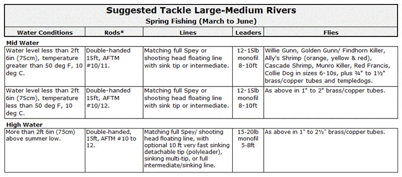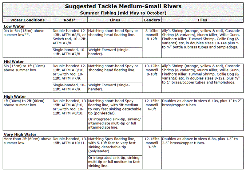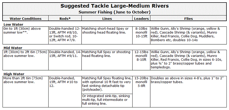The tables below offer some general recommendations on suitable tackle for Atlantic salmon fishing on the rivers of the Northern Highlands. Be aware that on rivers with hydro-electric schemes (Ness, Beauly, Conon, and Shin systems), water levels can change significantly and rapidly during generation, at any time throughout the season. Anglers that change their tackle to suit the water levels are more likely to be successful.